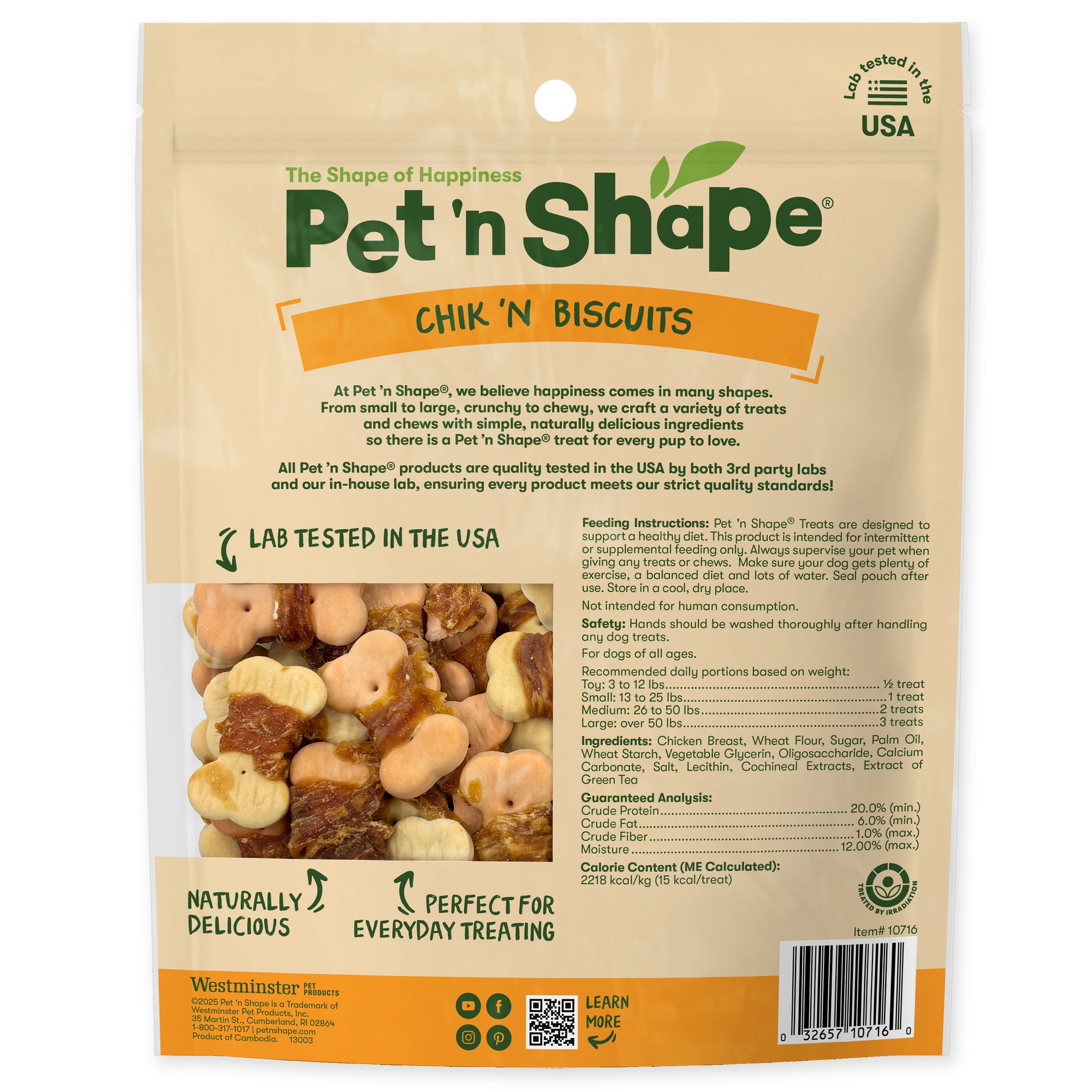 Pet 'n Shape natural Chik 'n Biscuits are the perfect snack size reward for pets of all shapes. Our Biscuits are baked to perfection with a savory slice of naturally delicious chicken breast wrapped delicately around the middle to provide your pet with a hearty, mouth-watering treat that will keep their tail wagging for more.