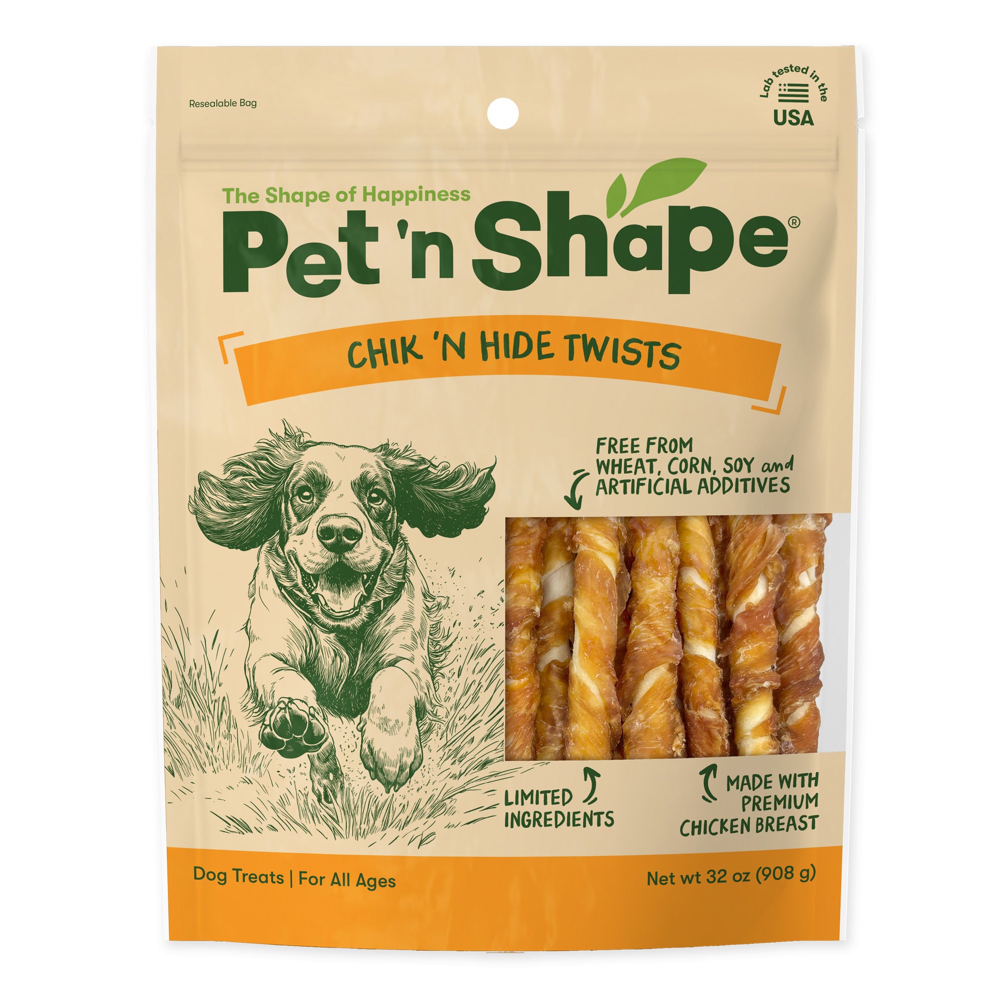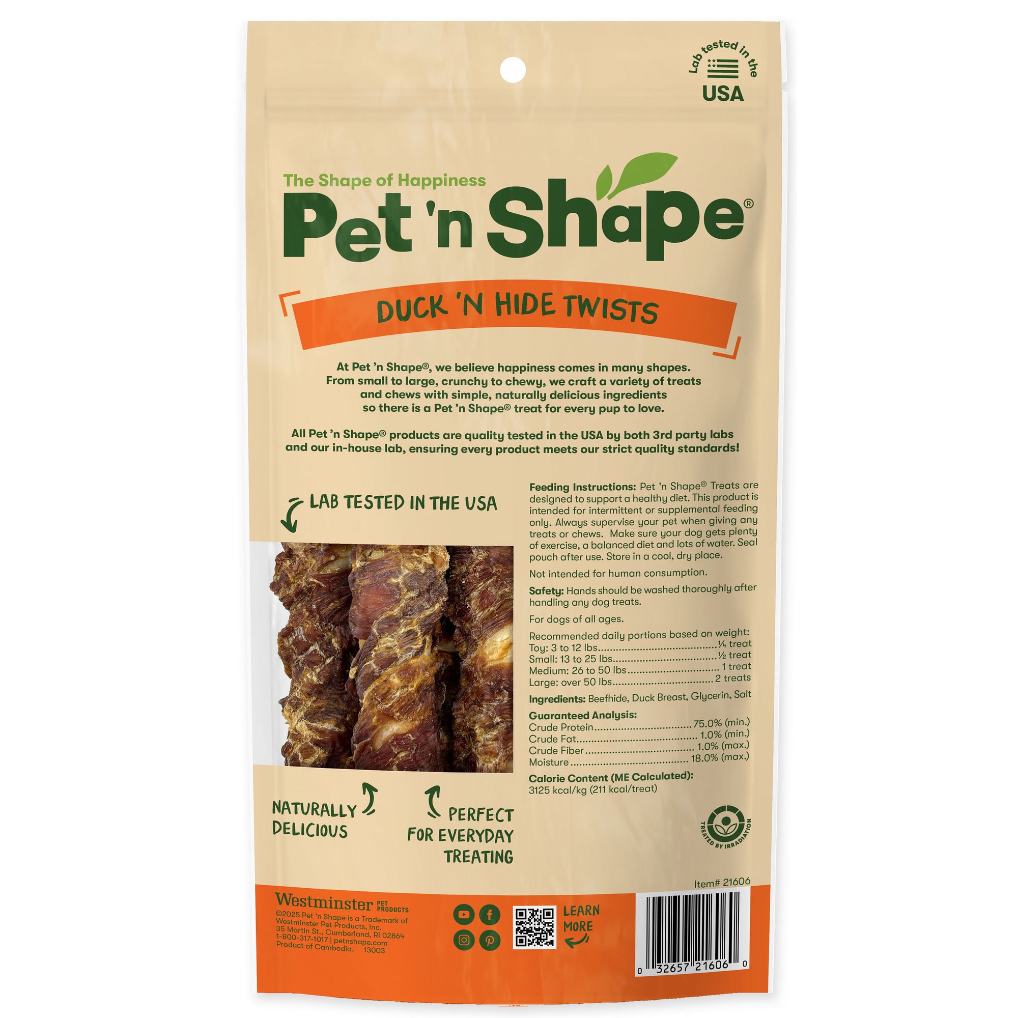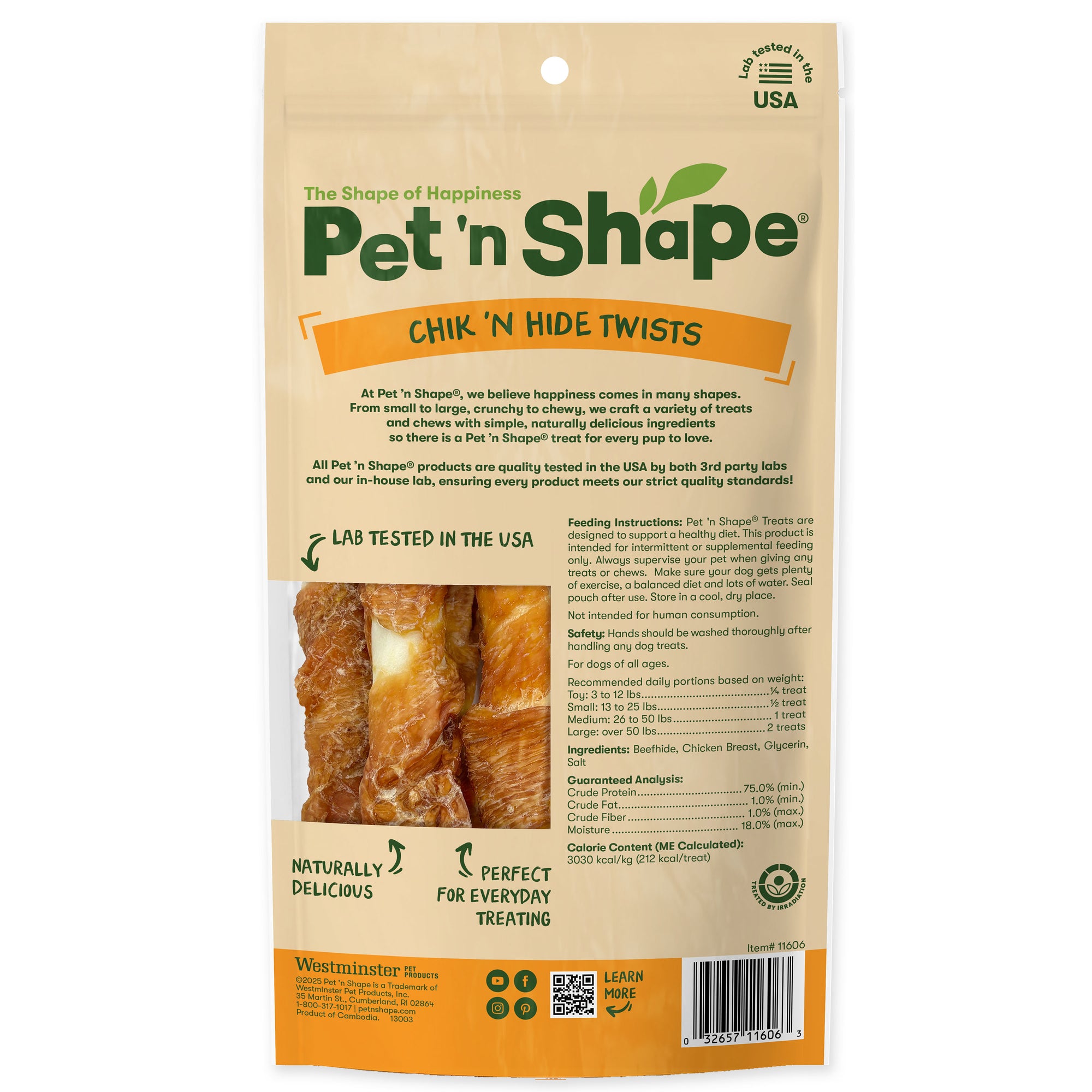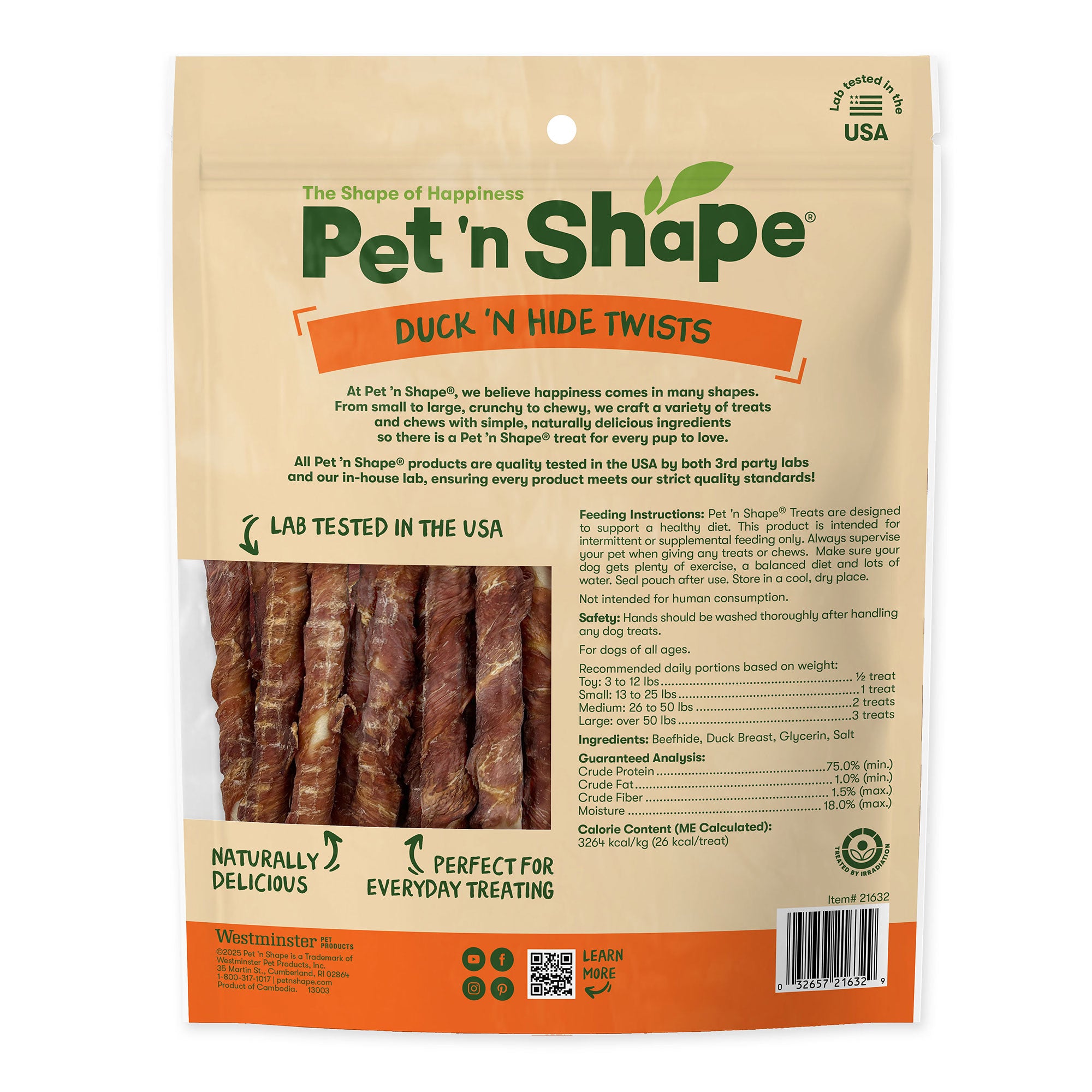 Pet 'n Shape natural Hide Twists are made from naturally delicious chicken or duck breast wrapped delicately around a savory rawhide chew. Small and large sizes are available to reward pups of all sizes.