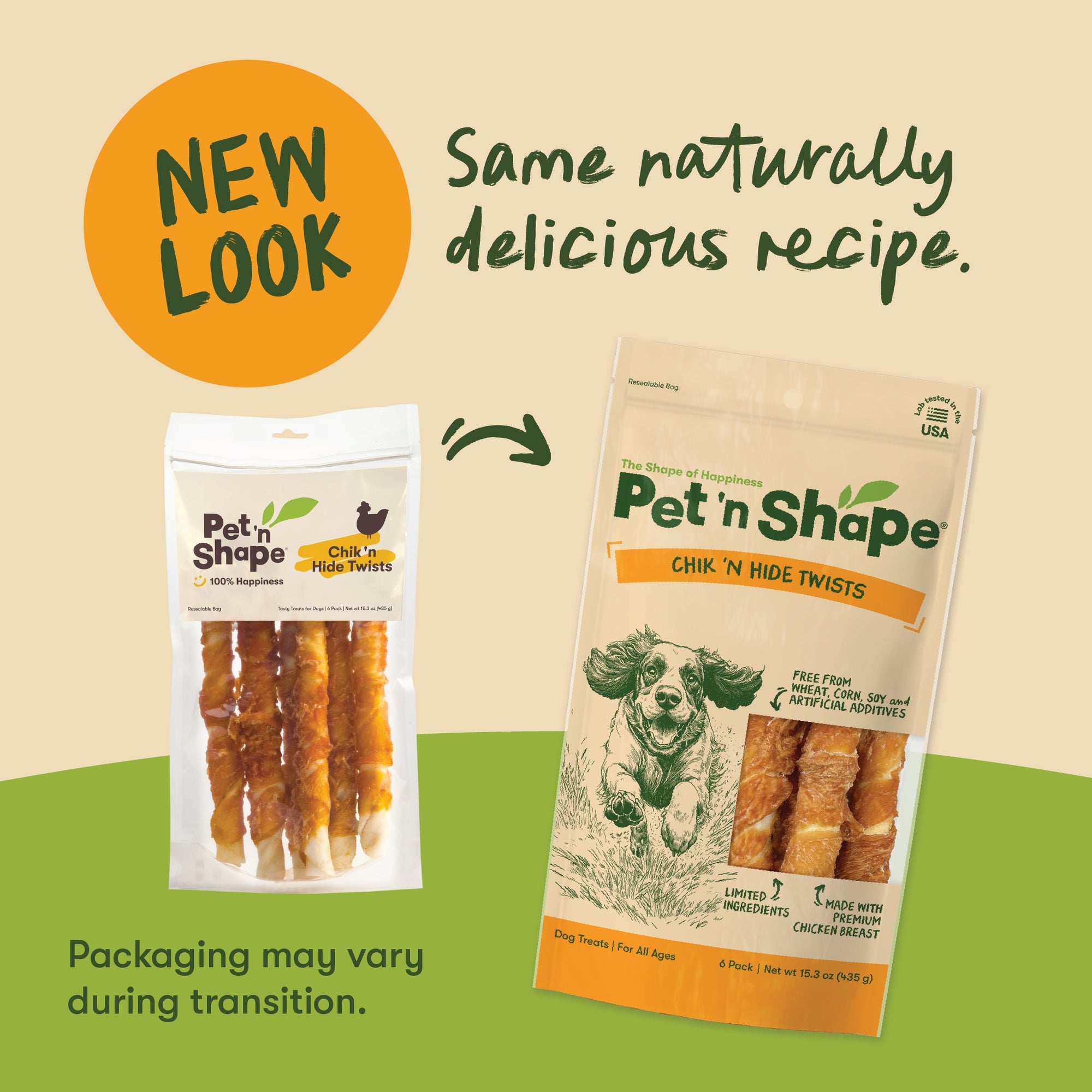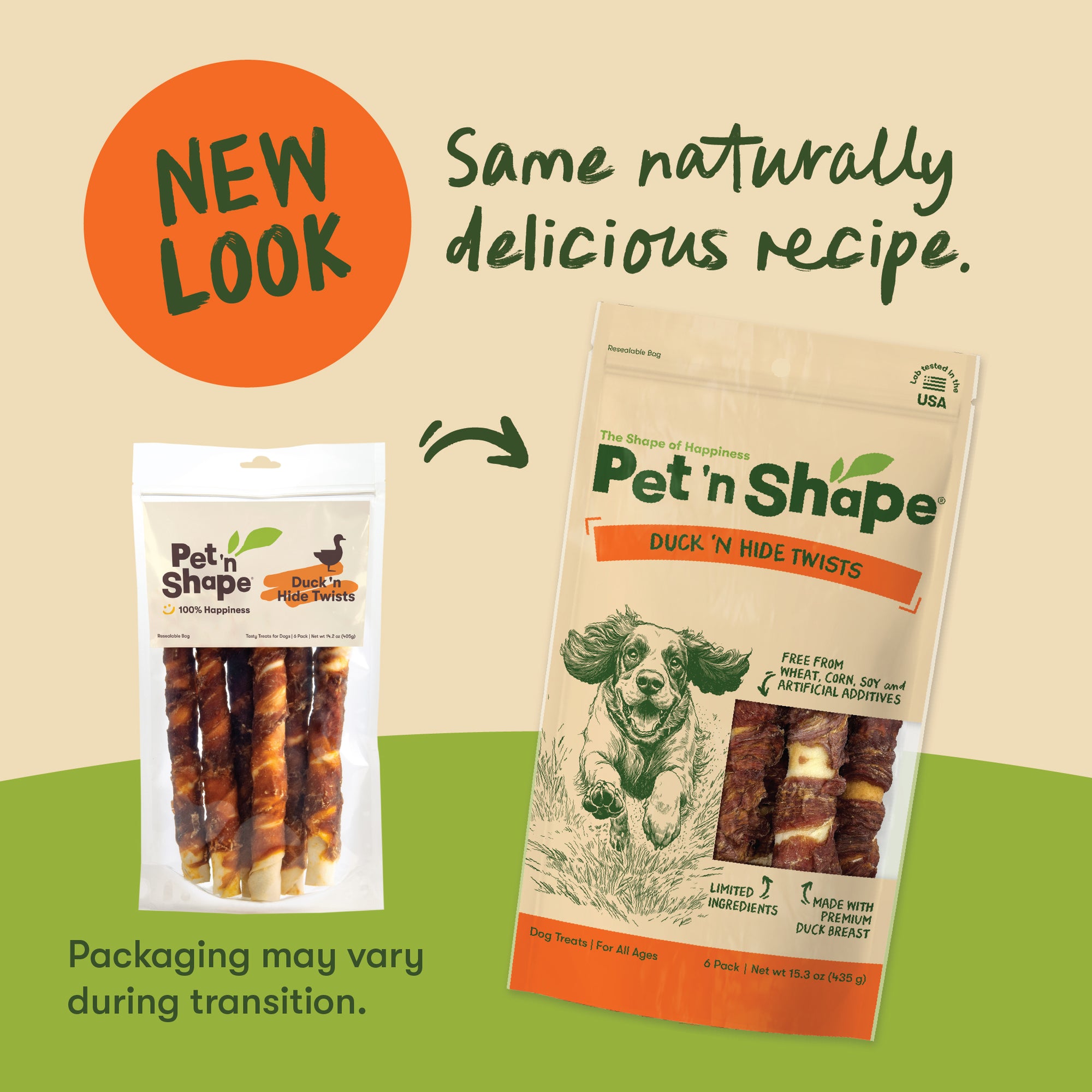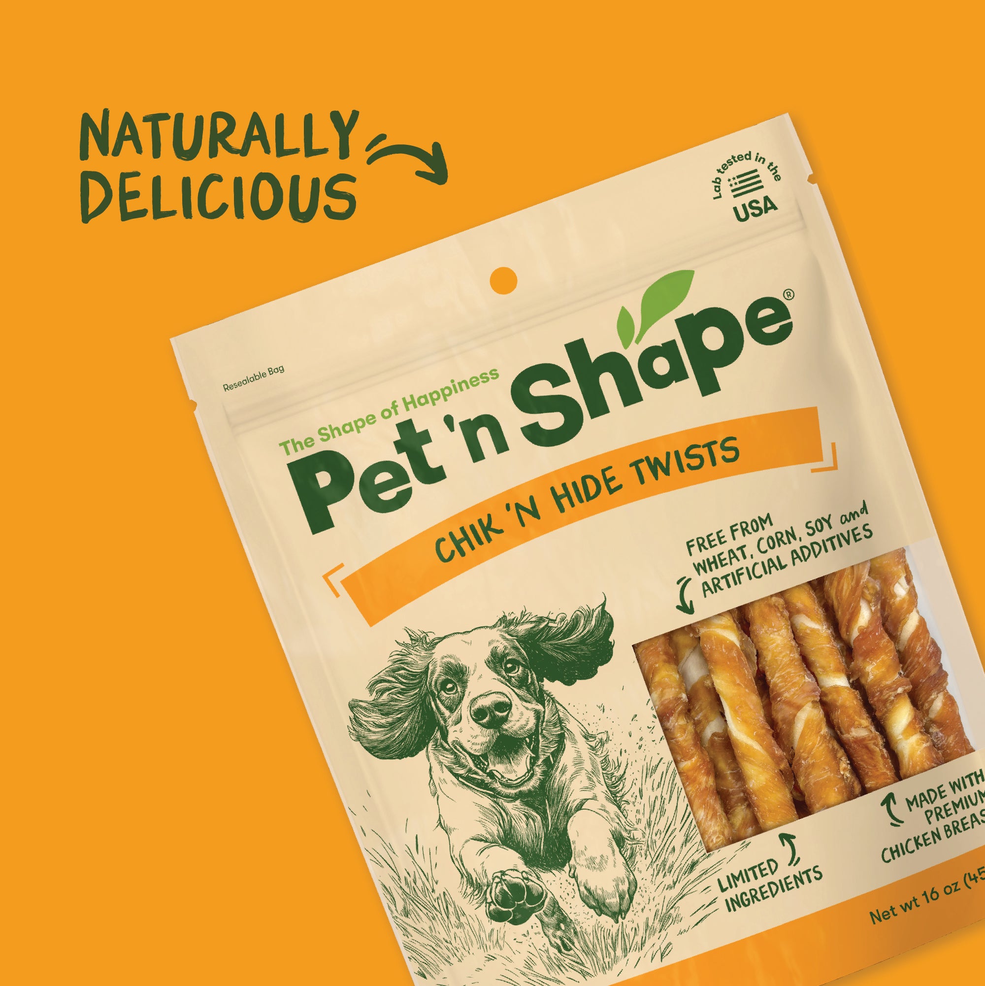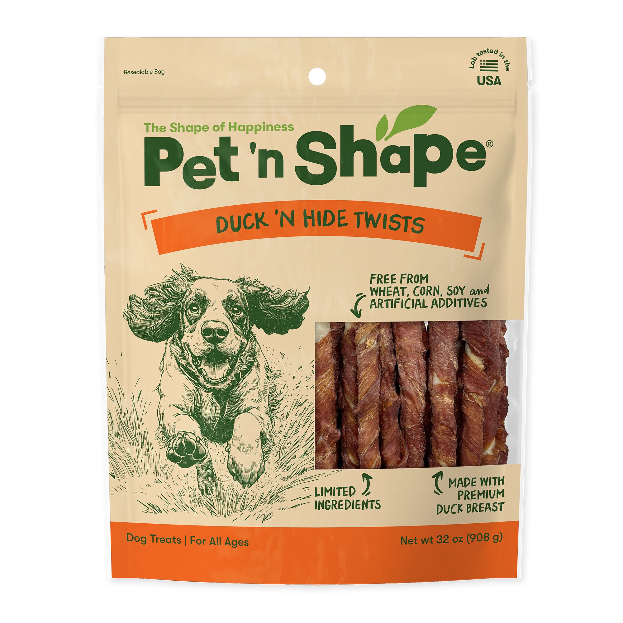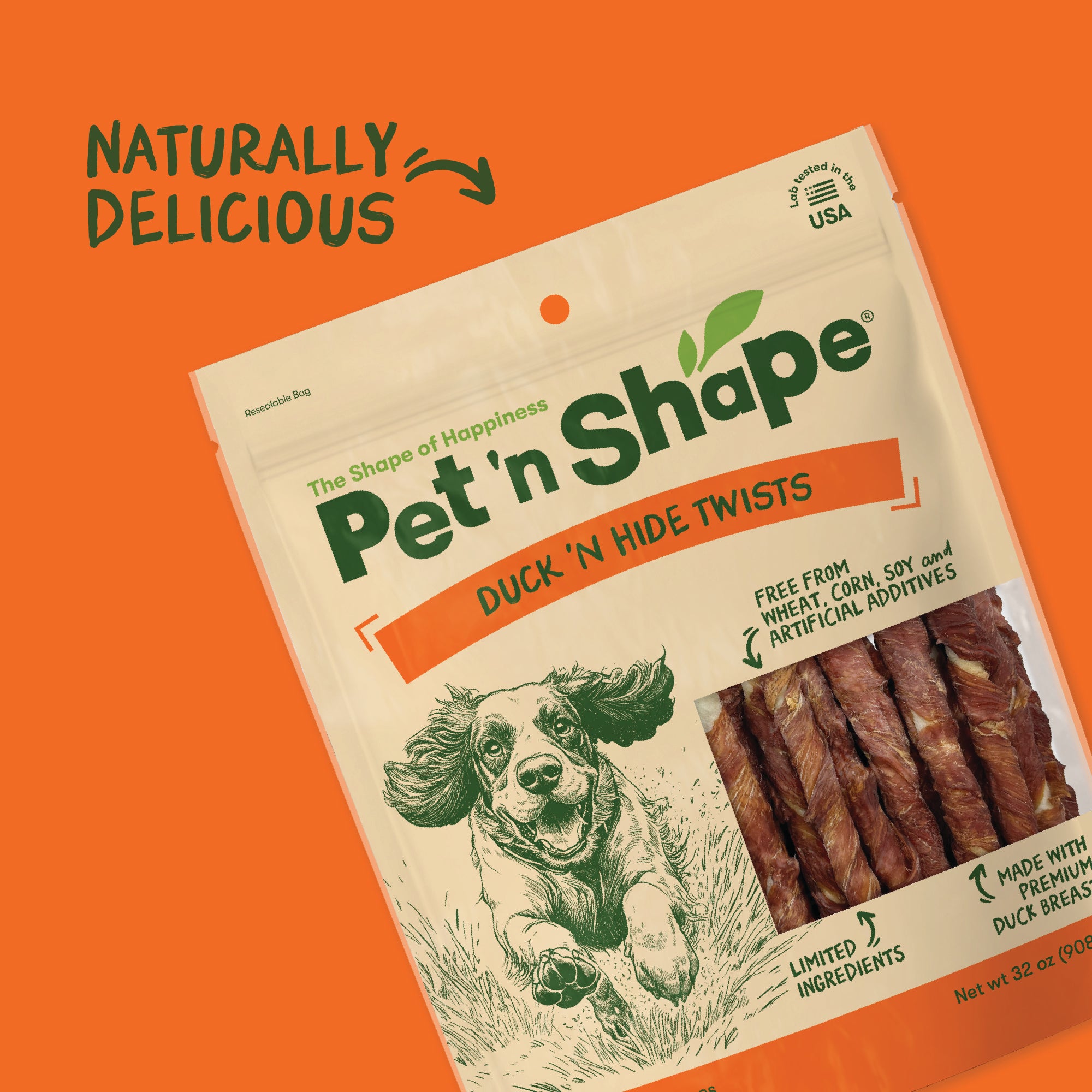 Pet 'n Shape natural Hide Twists are made from naturally delicious chicken or duck breast wrapped delicately around a savory rawhide chew. Small and large sizes are available to reward pups of all sizes.