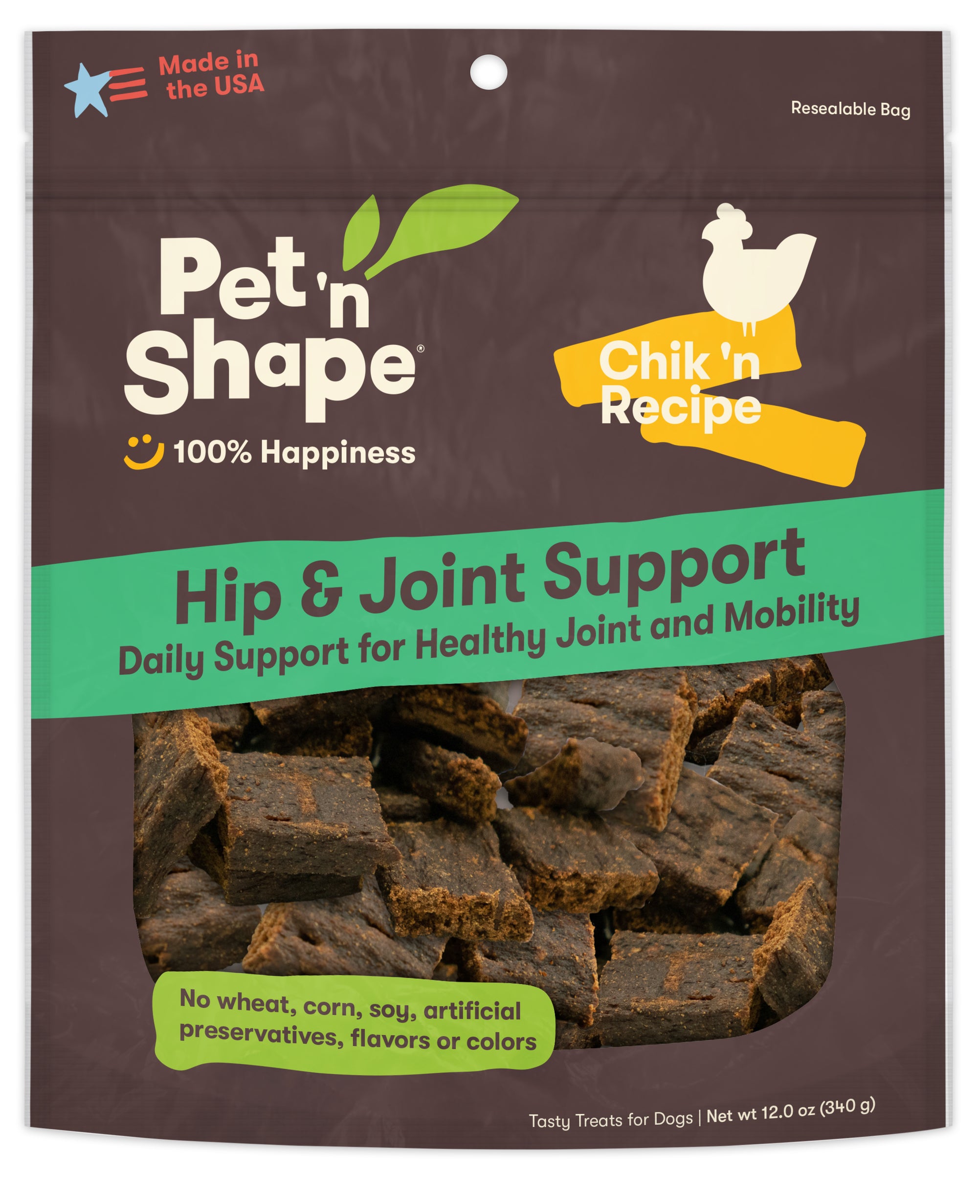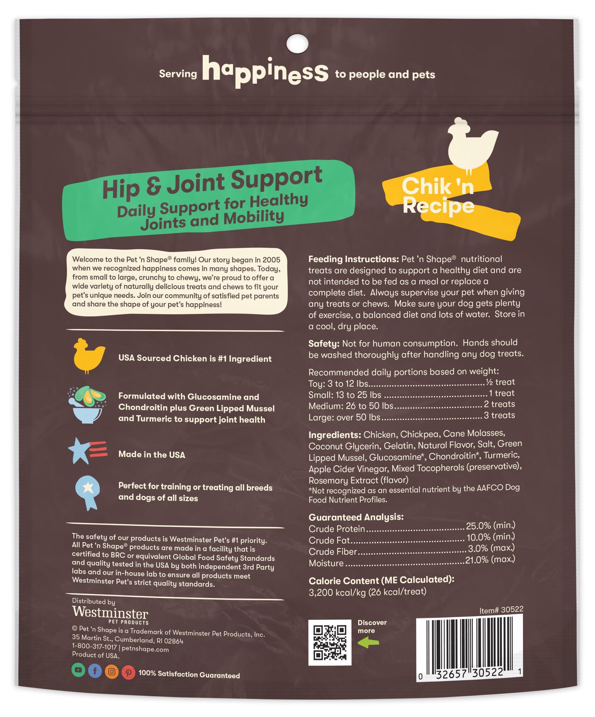 Pet 'n Shape® Hip and Joint functional treats may help provide hip and joint support for your dog while treating them to the delicious taste of chicken. Formulated with Glucosamine and Chondroitin, plus Green Lipped Mussel and Turmeric to help support joint health, our recipe is crafted with chicken and nutrient-rich chickpeas that dogs will love. Perfect for training or treating dogs of all breeds and sizes, our Hip and Joint Chik 'n Recipe treats are made in the USA.