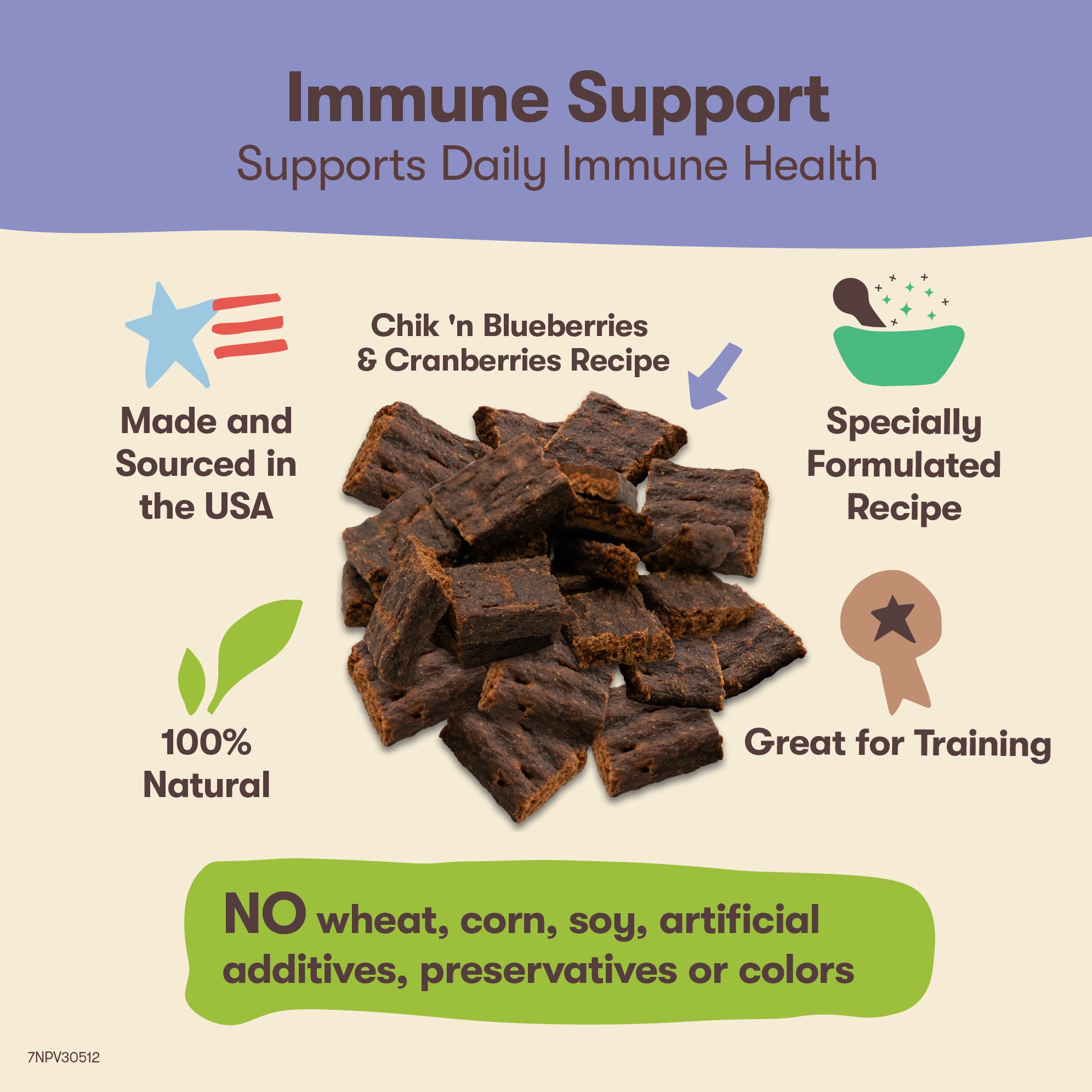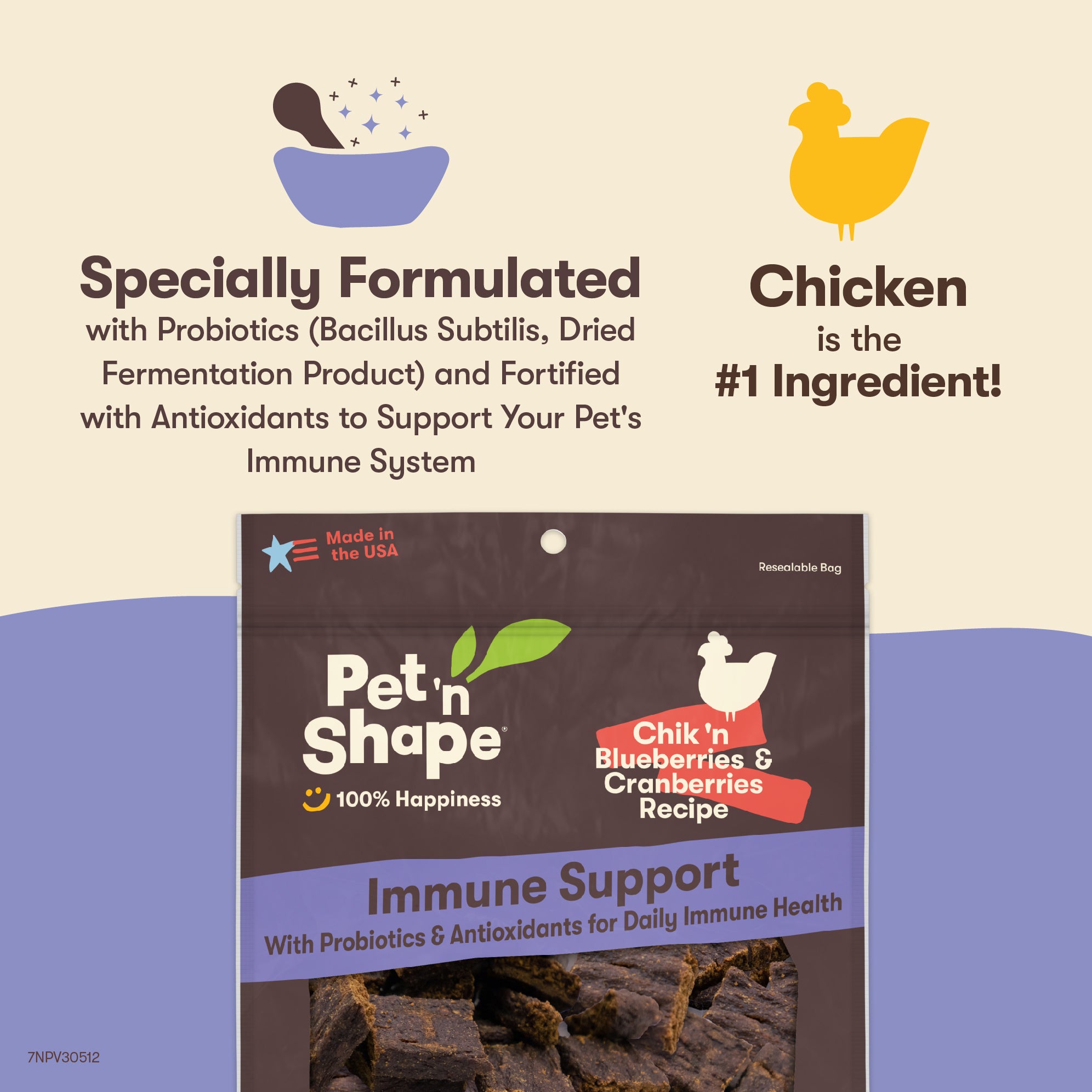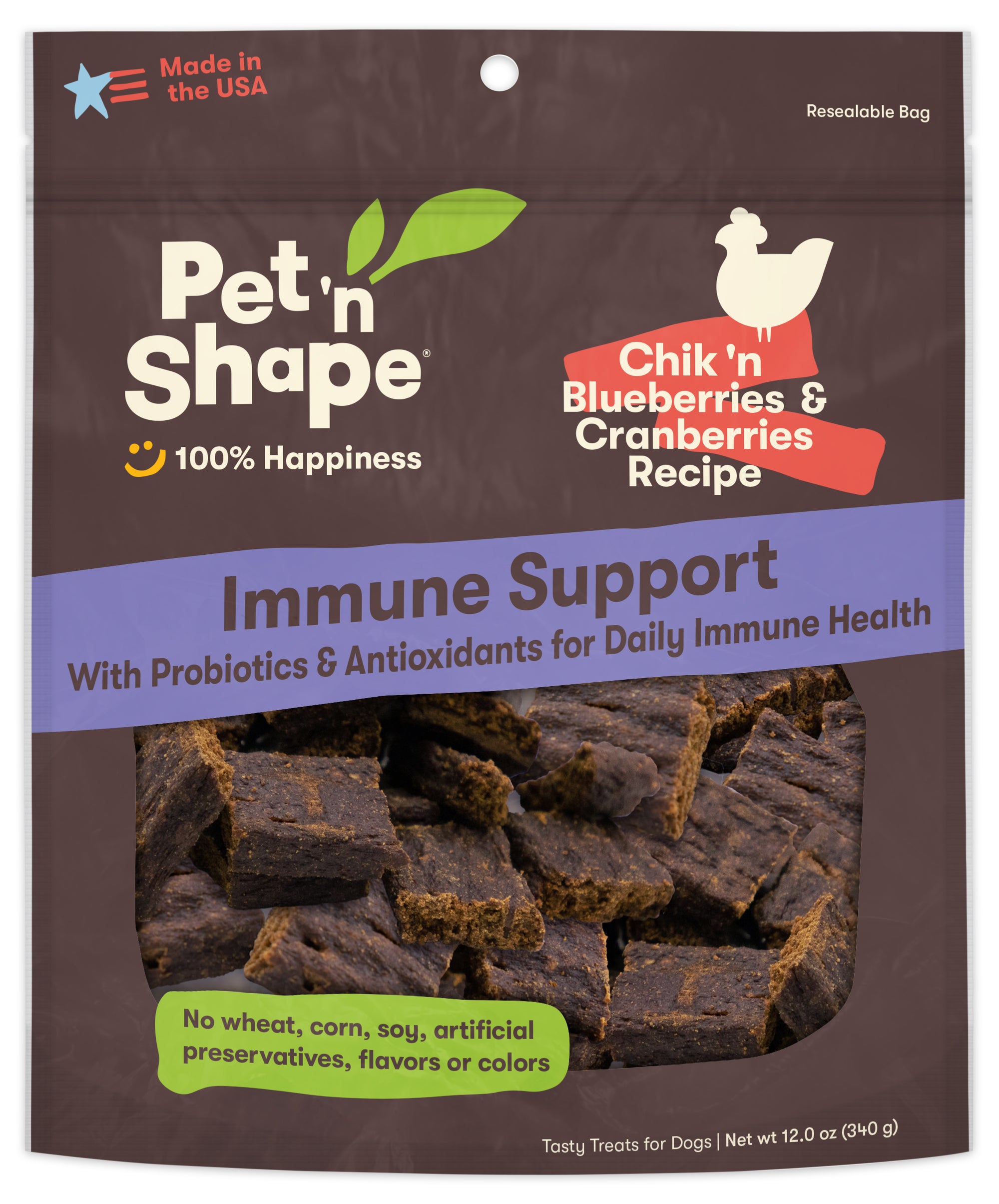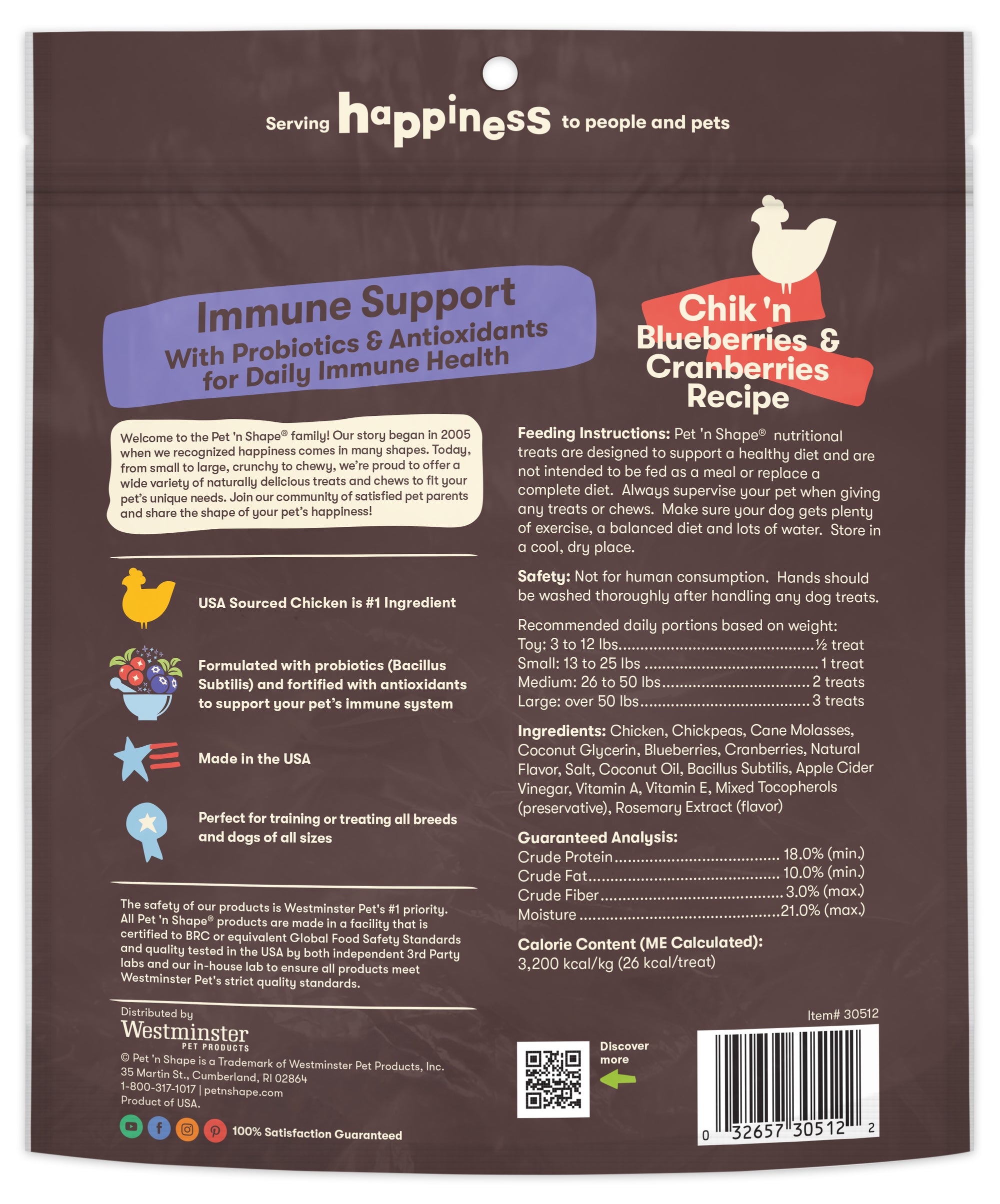 Pet 'n Shape® Immune Support functional treats may help provide immune support for your dog while treating them to the delicious tastes of chicken and berries. Formulated with probiotics and fortified with antioxidants to help support your dog’s immune system, our recipe is crafted with chicken and nutrient-rich cranberries and blueberries that dogs will love. Perfect for training or treating dogs of all breeds and sizes, our Immune Support Chik 'n Cranberries and Blueberries treats are made in the USA.