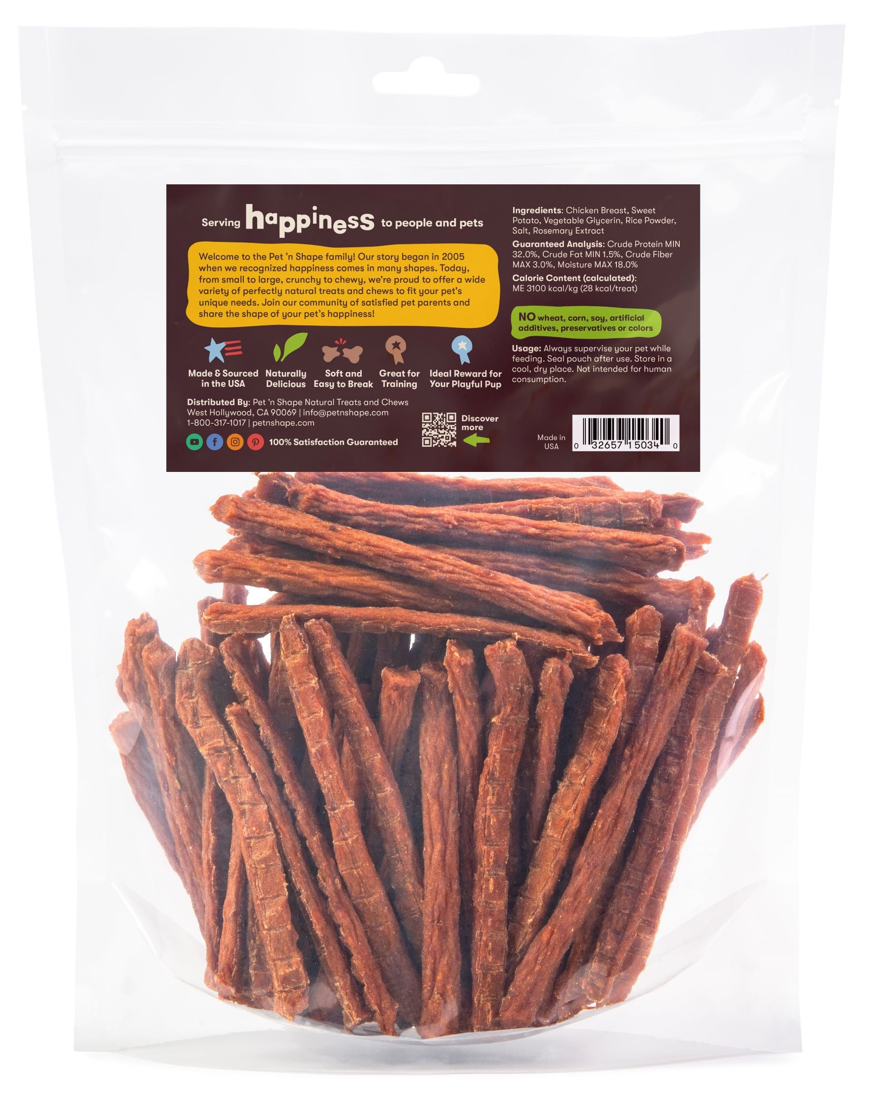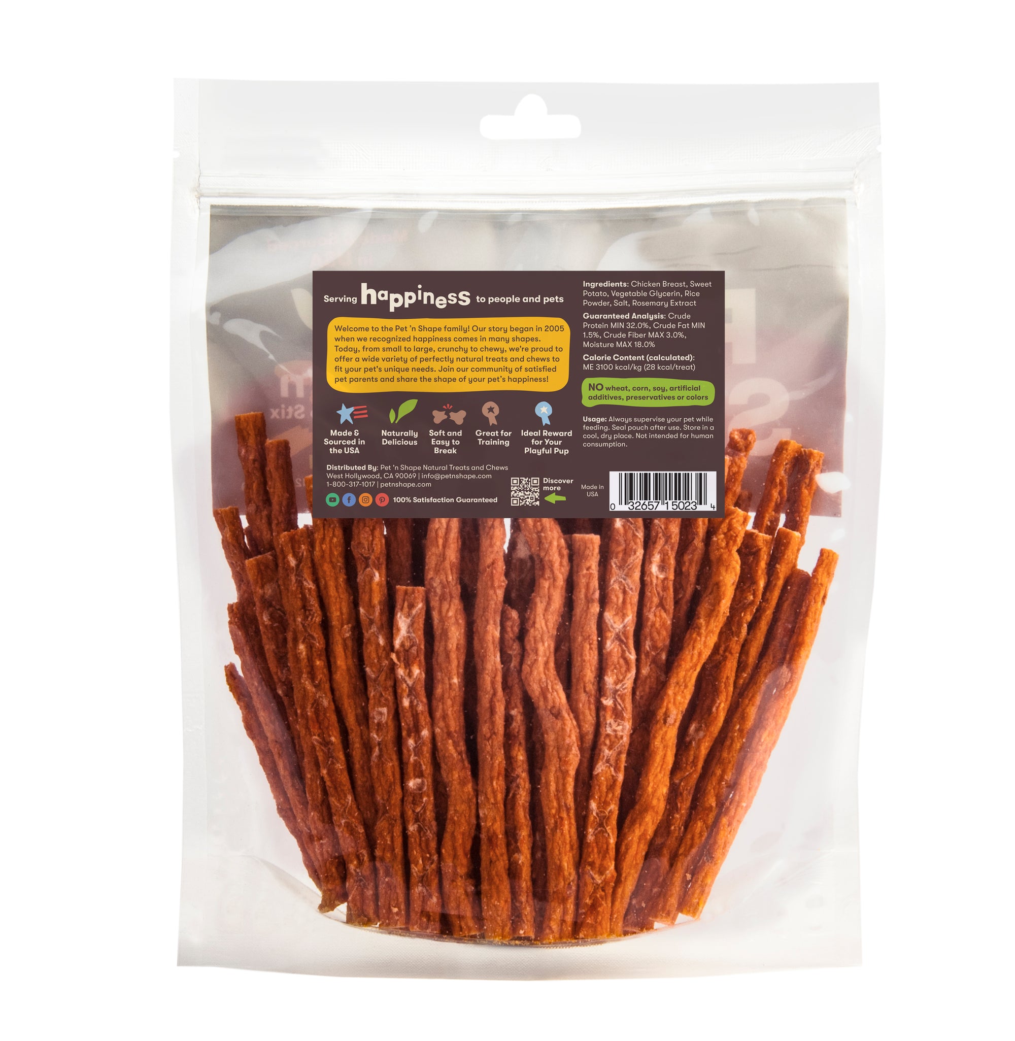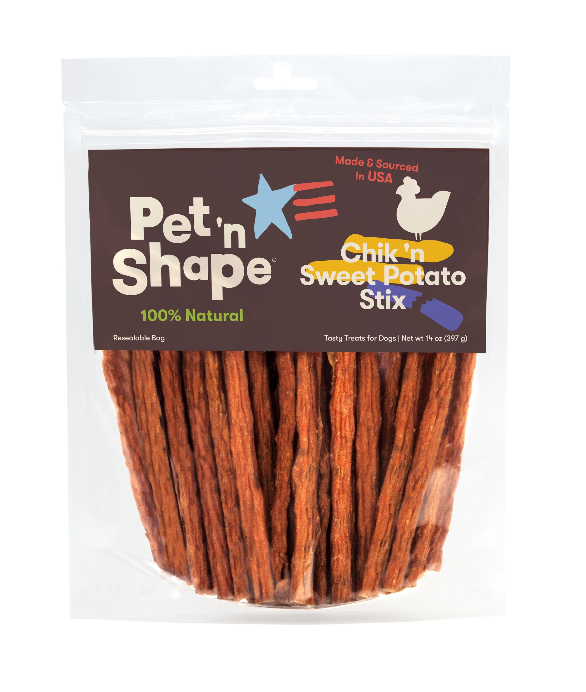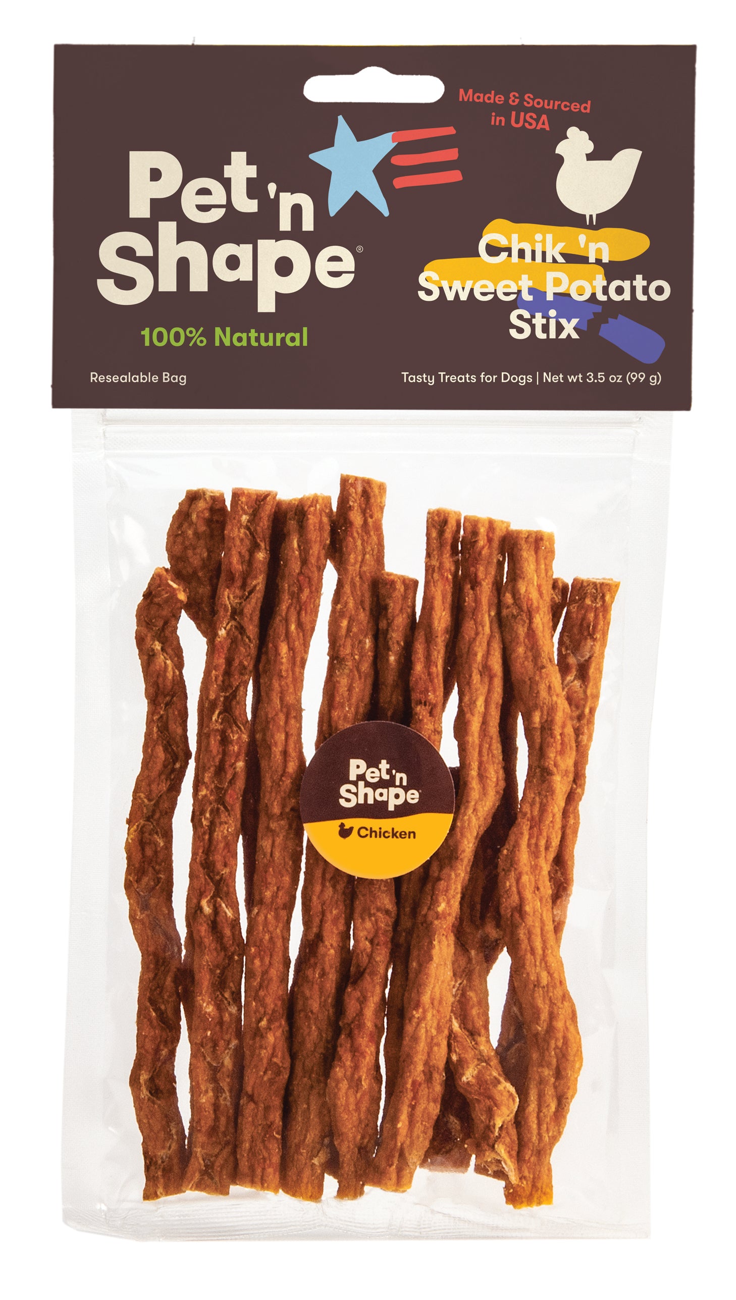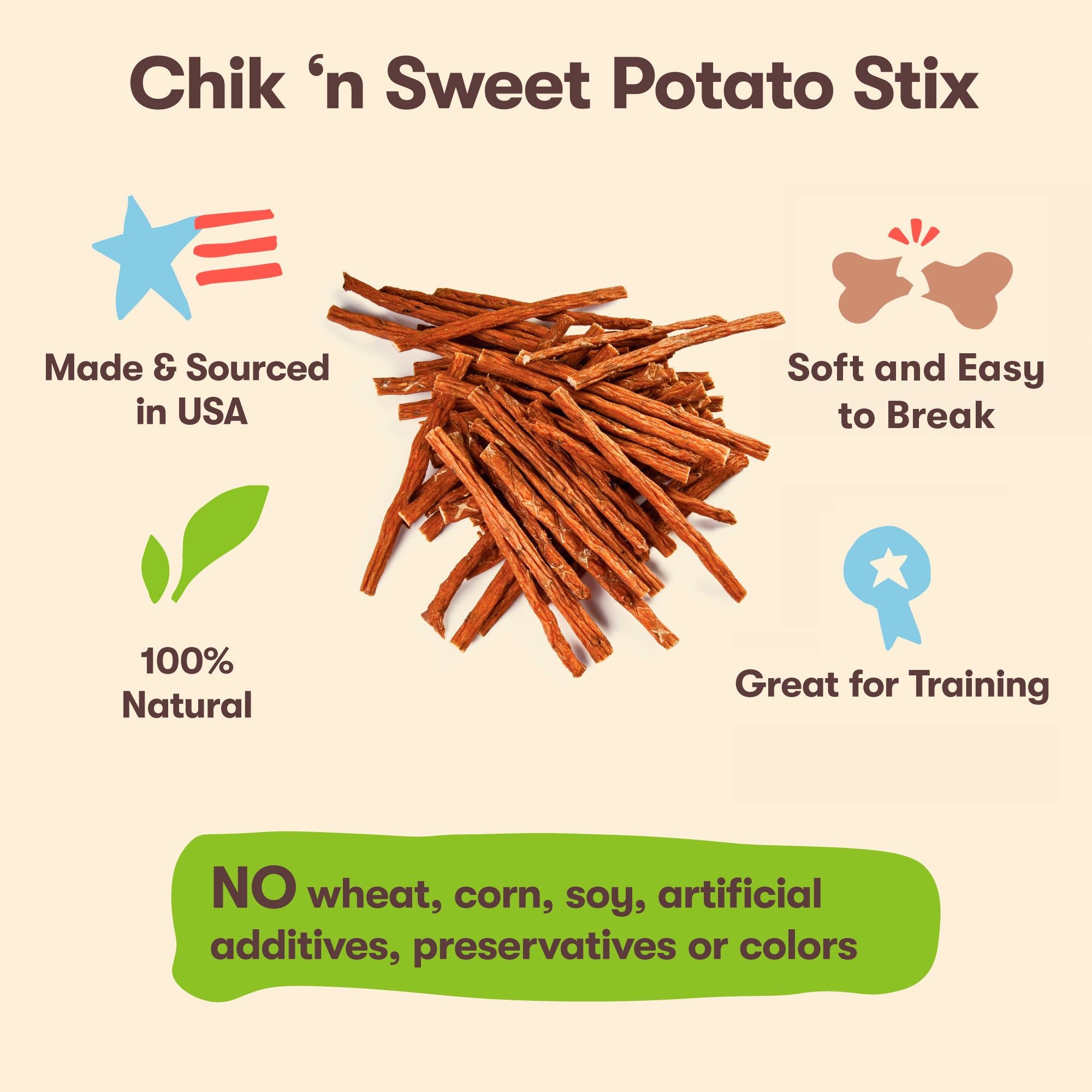 Our Chik ‘n Sweet Potato Stix are made from a 100% natural chicken and sweet potato medley formed into a savory stick. These crunchy treats are easy to break off into smaller pieces to satiate smaller pups. They contain no artificial colors, additives, or preservatives and are free of any wheat, corn, and soy.