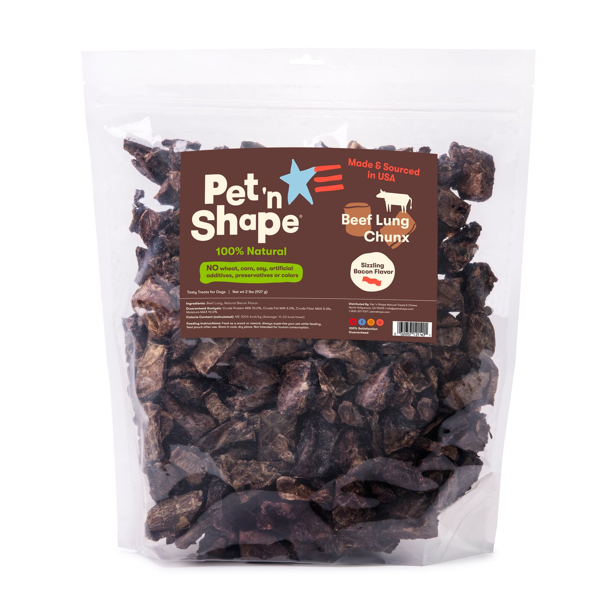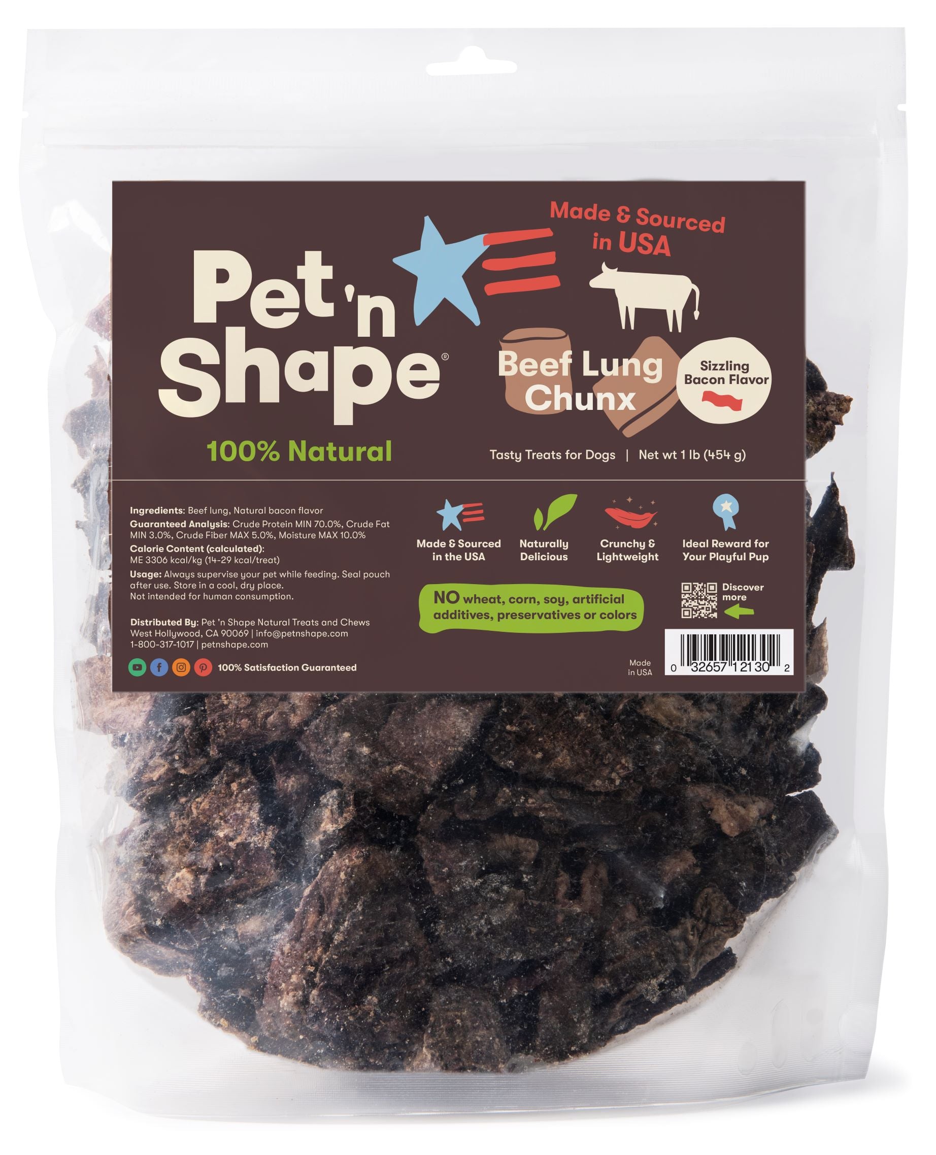 Pet 'n Shape Beef Lung Chunx are proudly Made and Sourced in the USA. This lightweight, crunchy, mouth-watering treat is ideal for playful pups of all sizes and may be broken into smaller pieces to use as a training tool. Made with real bacon combined with high protein beef lung, Chunx are enticing to even the pickiest pup.