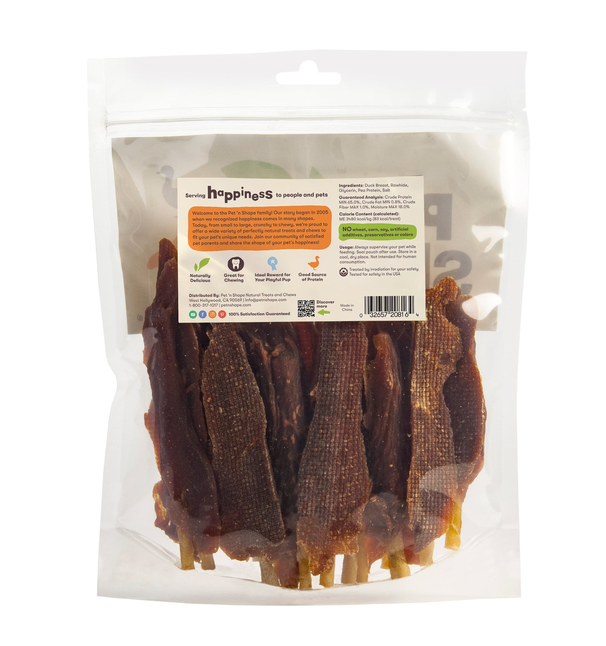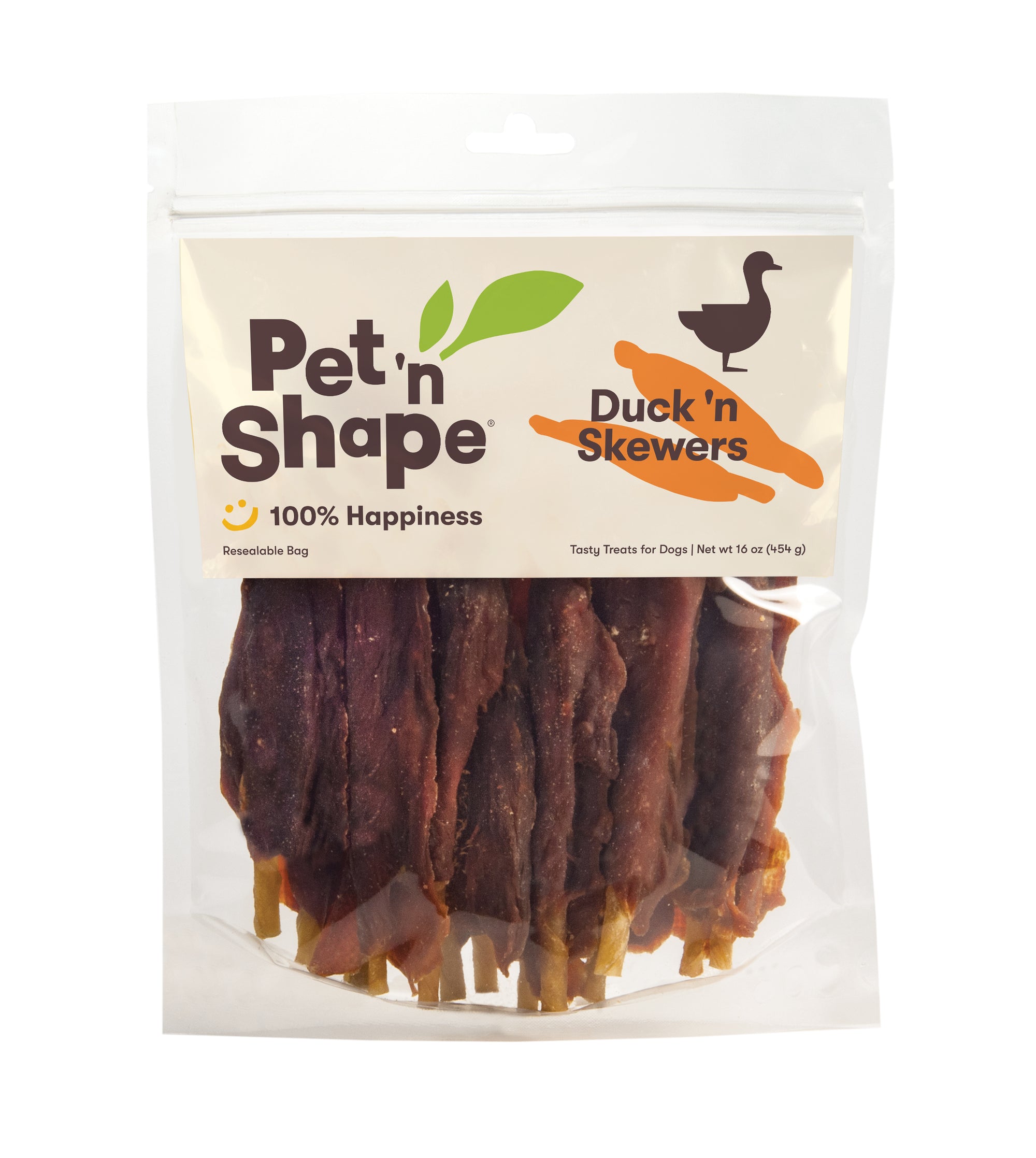 Pet 'n Shape Duck Skewers are high protein, low fat, and are great to reward your pup. They are made with naturally delicious duck breast fillets wrapped around natural rawhide. Each highly nutritious treat is completely digestible and is carefully roasted to ensure optimal quality and flavor.