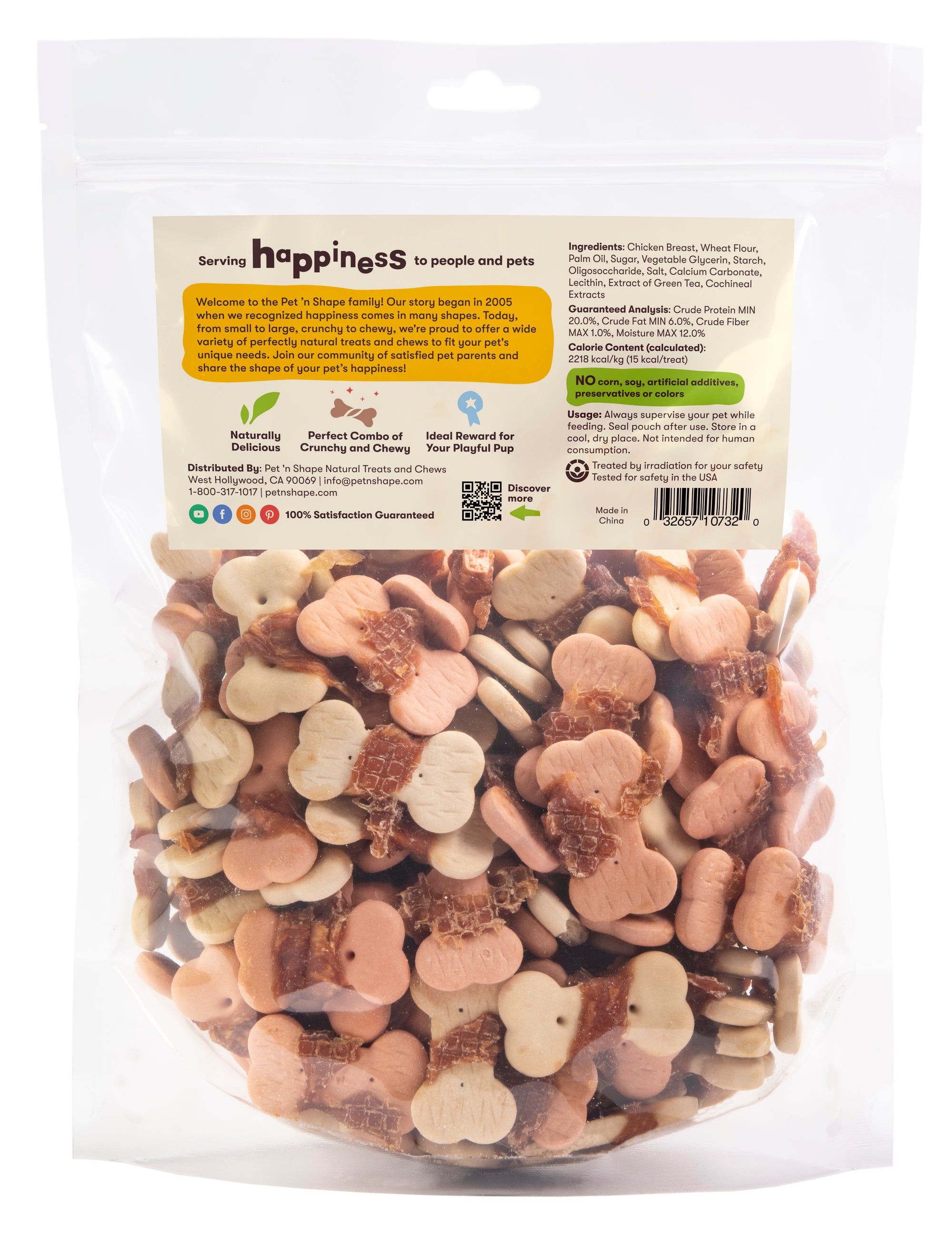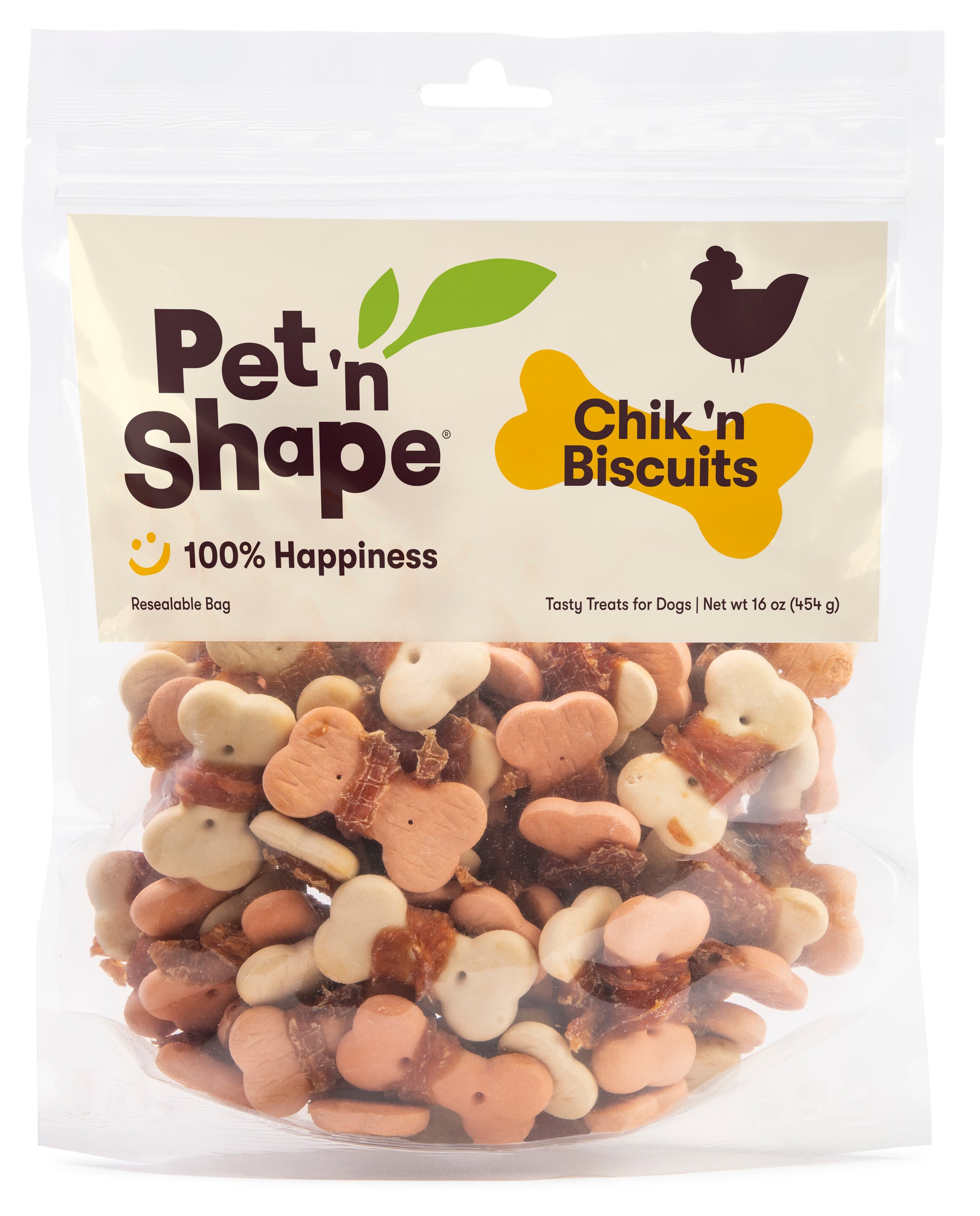 Pet 'n Shape natural Chik 'n Biscuits are the perfect snack size reward for pets of all shapes. Our Biscuits are baked to perfection with a savory slice of naturally delicious chicken breast wrapped delicately around the middle to provide your pet with a hearty, mouth-watering treat that will keep their tail wagging for more.