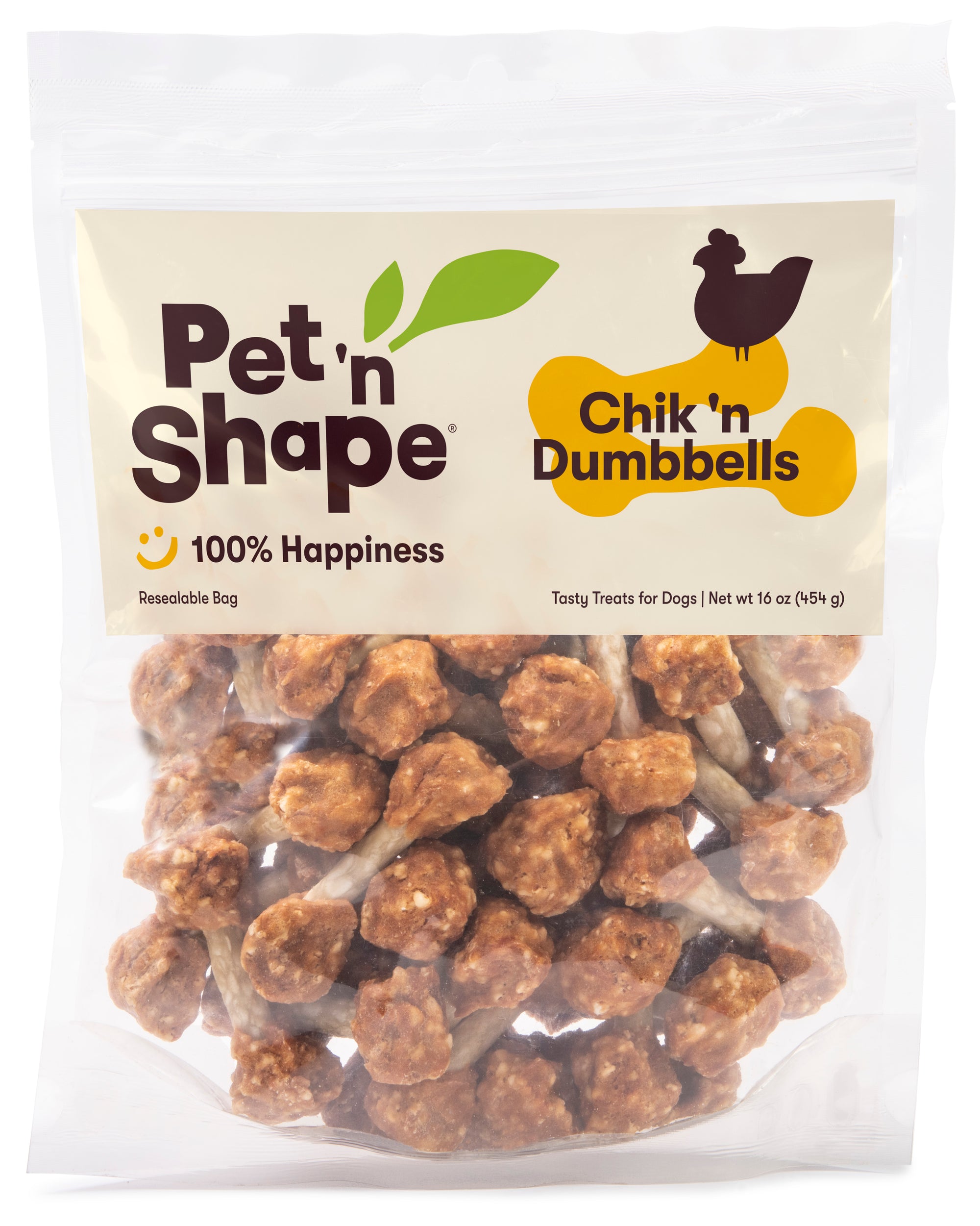 Pet 'n Shape Chik 'n Dumbbells Natural Dog Treats provide your dog with a high-protein, low-fat and One size fits all. Our Dumbbells are made with naturally delicious chicken and hearty white rice on a rawhide stick, free of any bleaches or formaldehyde, making it a longer-lasting, crunchy treat for your dog to go crazy over. Each highly nutritious treat is completely digestible and is carefully roasted to ensure optimal quality and taste. They contain NO artificial additives, colors, or preservatives. Our Dumbbells are free of any wheat, corn, and soy.