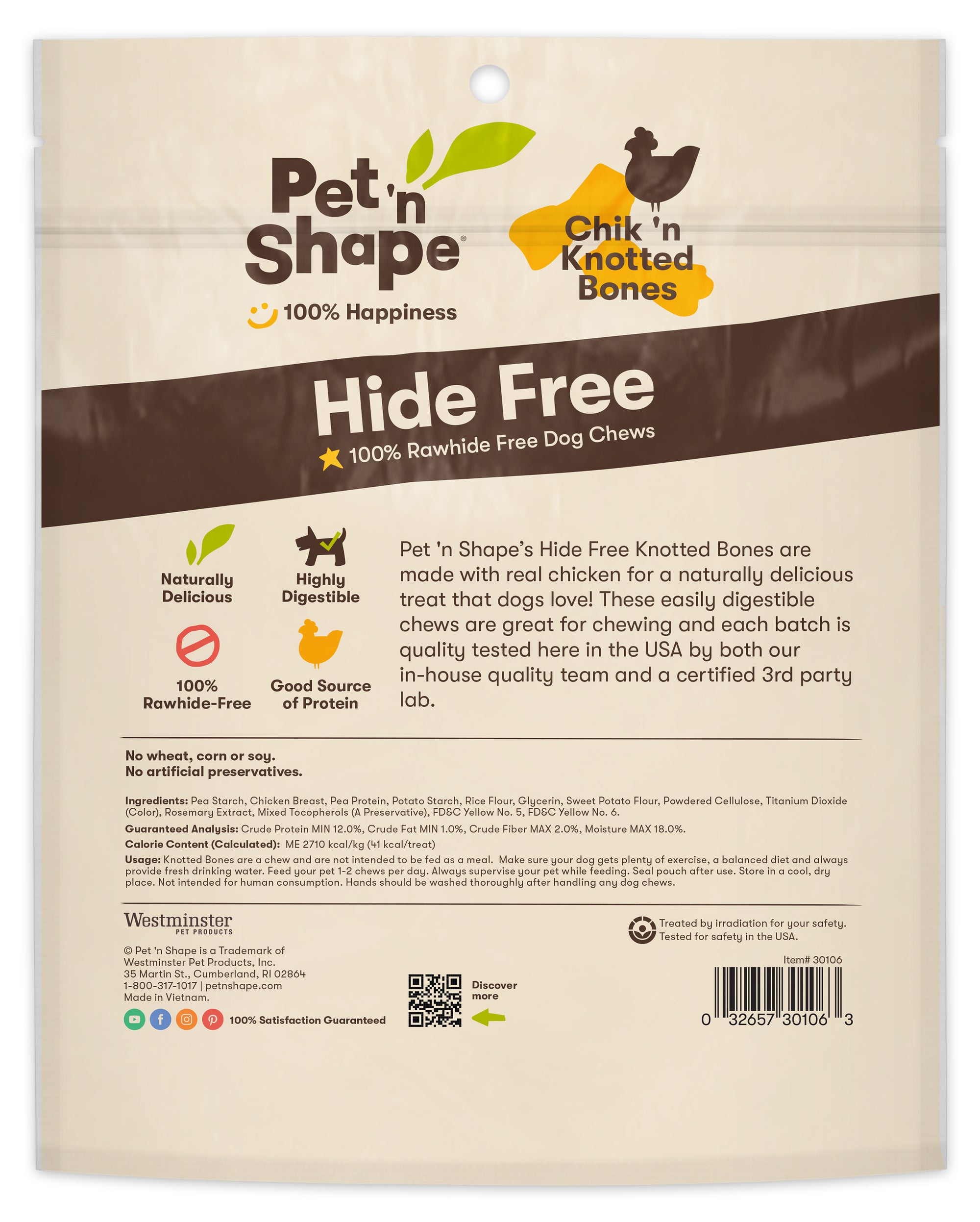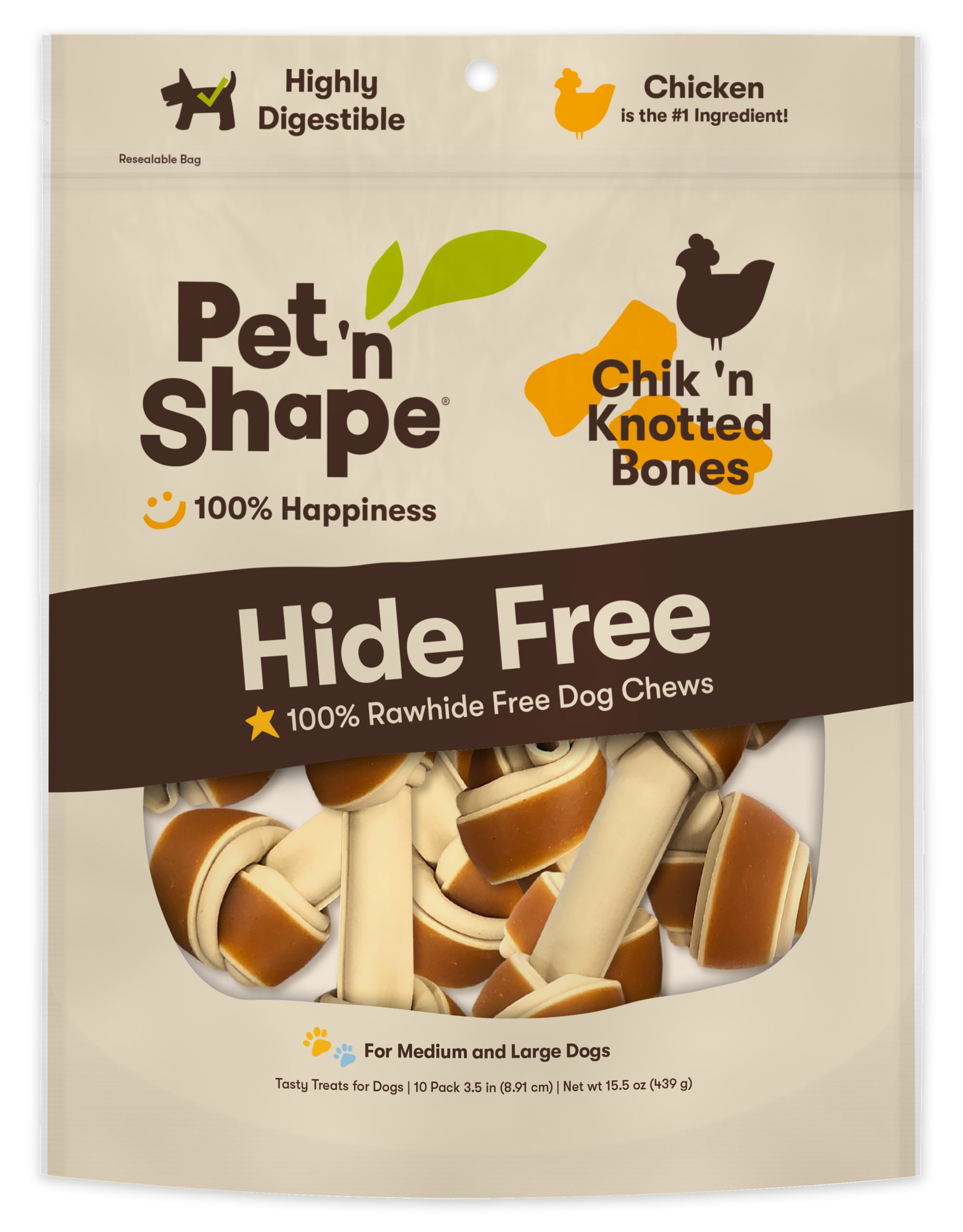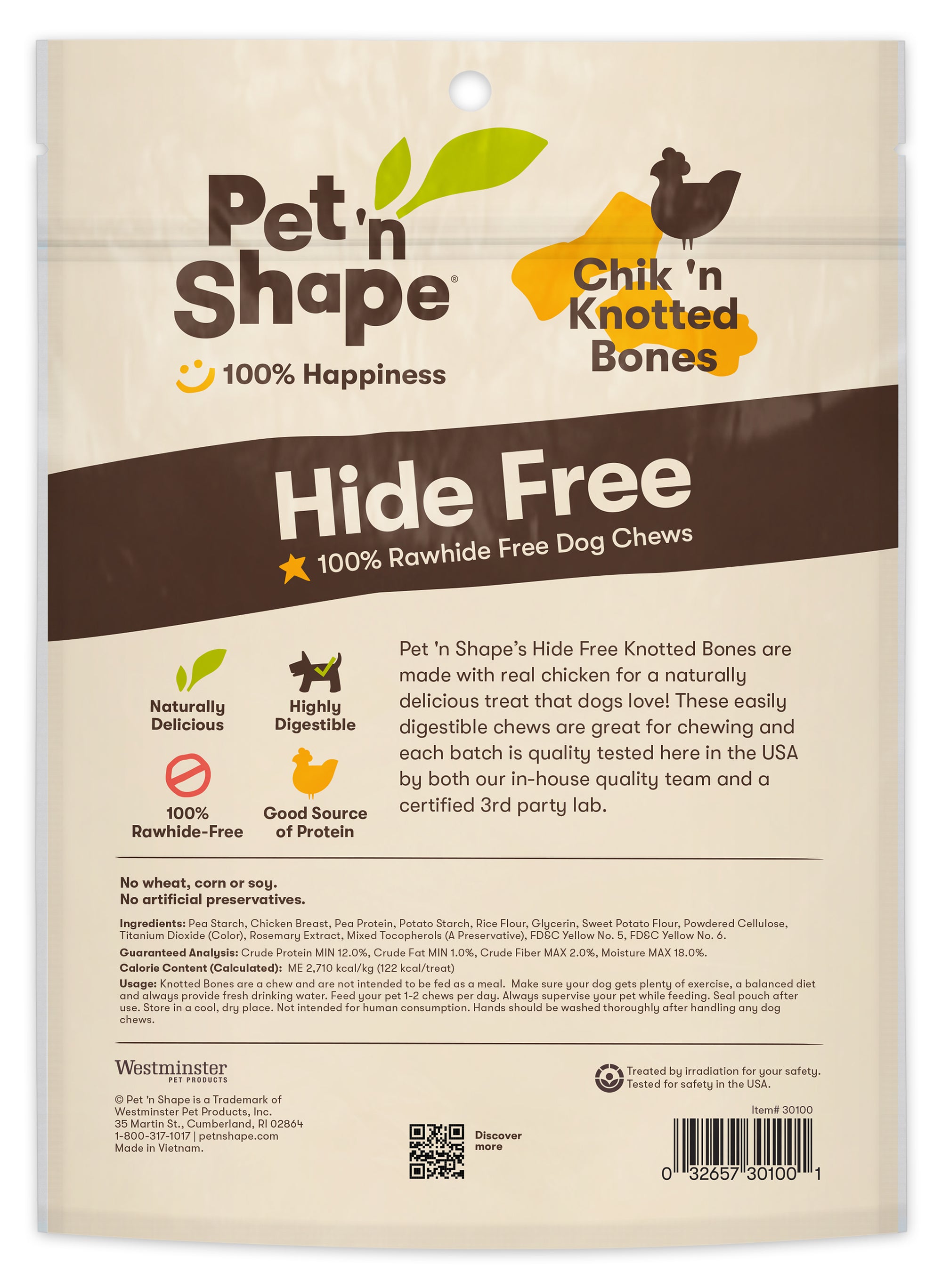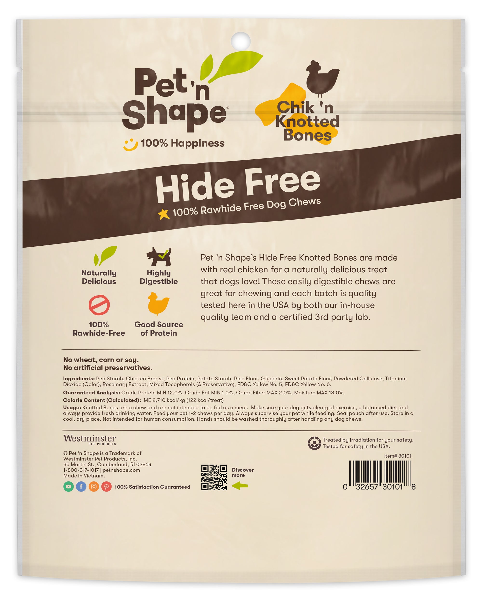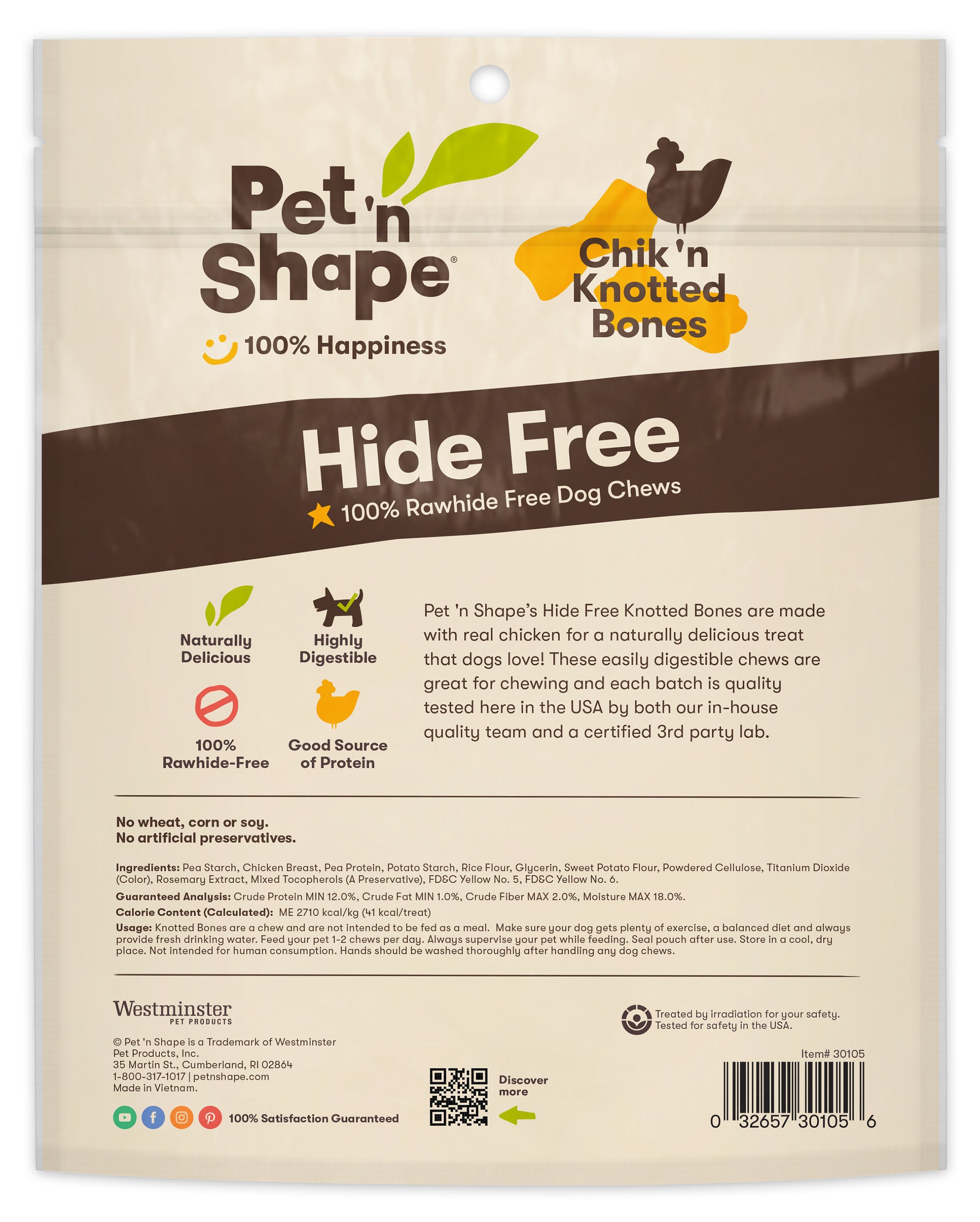 Treat your furry family member to a hide free chew built for taste with Pet 'n Shape Hide-Free Two-Tone Chik 'n Knot Bones dog treats! These naturally delicious treats are individually knotted and are made with real chicken. Each treat is designed to give your pup more of what you want and less of what you don't, these chews don’t contain preservatives or grains.